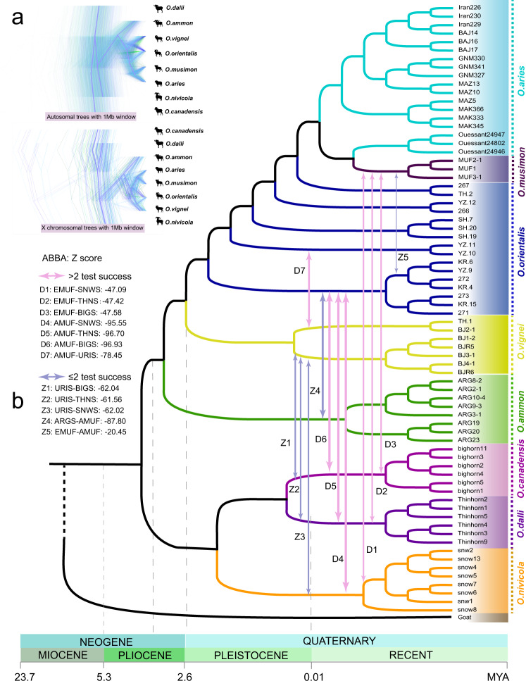 Relation based on X chromosome and autosomes, arrows are introgression pairs from hybridization or backcrossing. European Mouflon (O. Musimon) have a common ancestor with O. aries then O. orientalis. Introgressions for European Mouflon occur with O. orientalis, O. canadensis, O. dolli and O. nivicola.